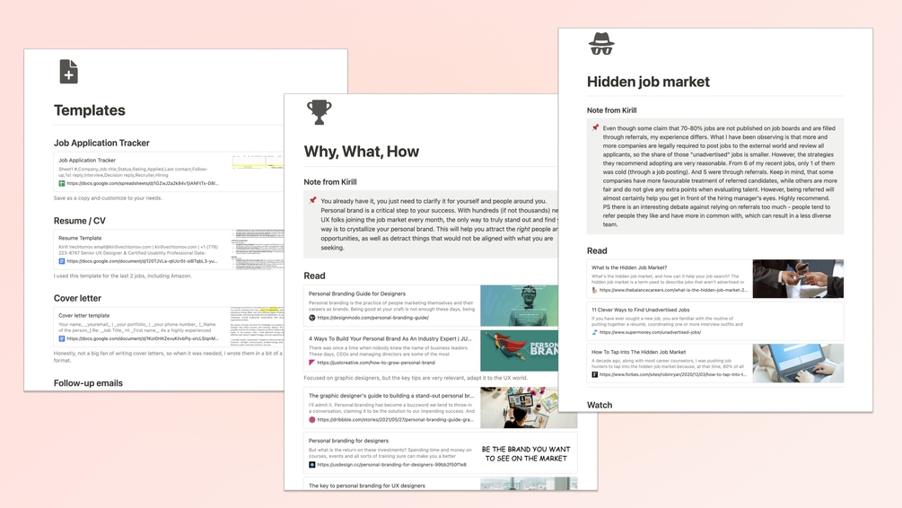 Access to Notion board with a compilation of hand-picked articles, videos, podcast, tools, and resources that will help you get a job in UX